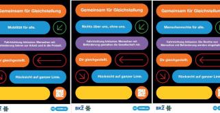 The image shows three poster motifs arranged next to each other on a black background. Each poster is graphically designed in the style of information on public transport and bears the orange bar at the top with the inscription: "Together for Equality".