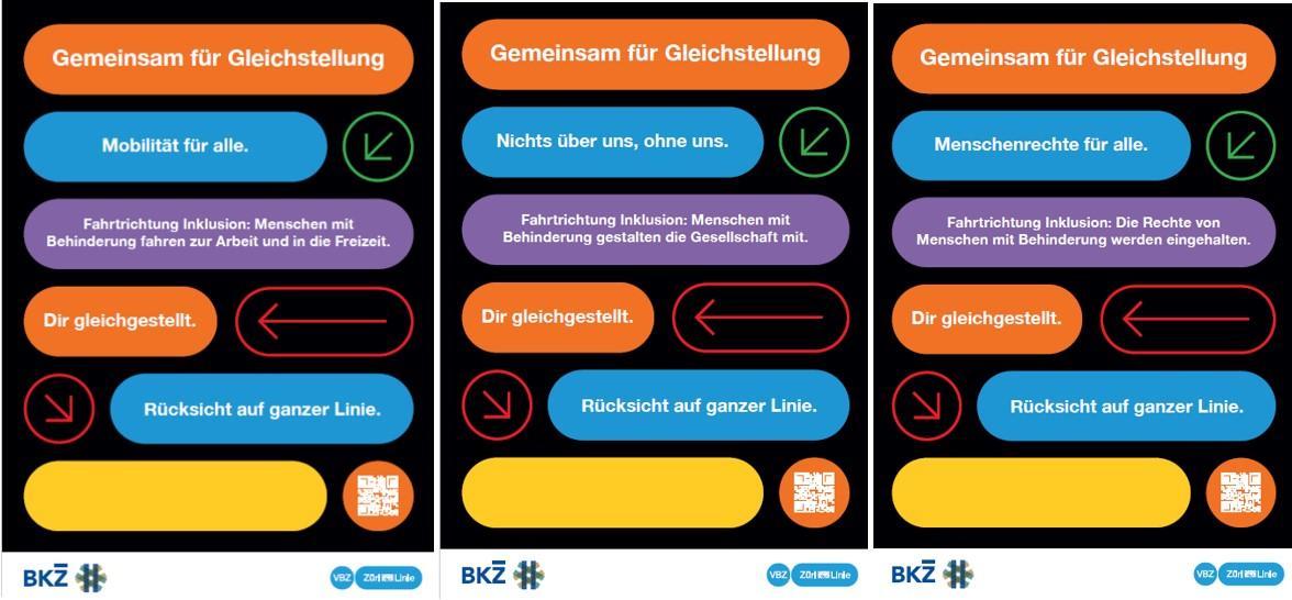 All three posters contain a yellow field with a QR code in the bottom right-hand corner, as well as logos for BKZ, VBZ and "Züri lebt Inklusion".